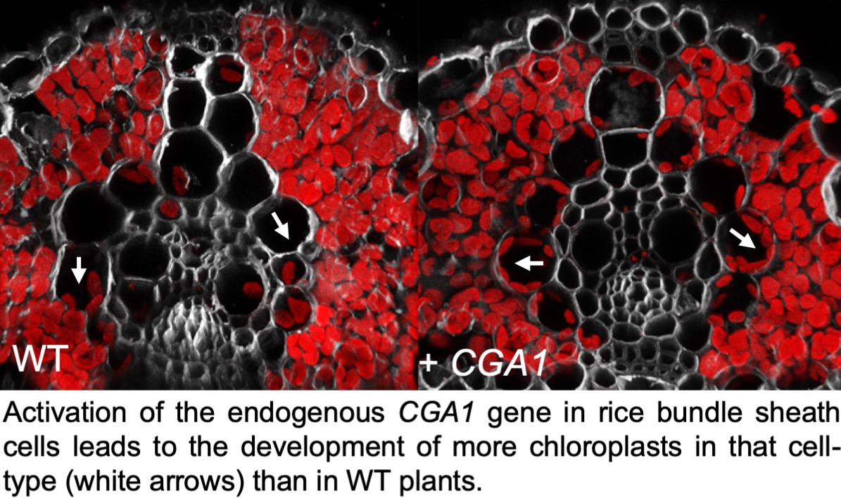 The search for additional activators of chloroplast development continued, requiring the establishment of rapid (see paper here) and/or deep-learning based (see paper here) methods to quantify chloroplast volume in the process. Although not as great as that seen in lines overexpressing the maize G2 gene, an increase in bundle sheath chloroplast content was observed in lines in which the rice CGA1 gene was activated in bundle sheath cells (see paper here). These observations prompted experiments to simultaneously manipulate both genes, the tantalizing results of which are currently being evaluated.