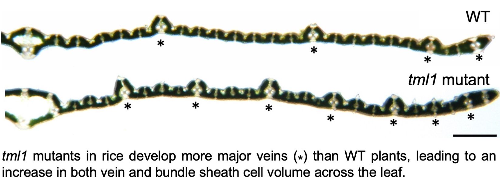 Further analysis of SHORTROOT pathway function, specifically in relation to function of the interacting SCARECROW (SCR) protein, confirmed a role for the pathway in patterning mesophyll cells in the maize leaf (see paper here), and again showed relationships between patterning of inner leaf tissues and stomatal development (see paper here). Unfortunately, however, manipulation of function in rice did not alter inner leaf anatomy but instead abolished stomatal development (which was not very helpful!) (see paper here). Meanwhile, the pursuit for regulators of vein formation continued, resulting in the identification of the zinc finger protein ‘TOO MANY LATERALS (TML)’. The discovery that the TML1 gene is expressed in developing minor but not major veins of maize leaves (see paper here), led to the hypothesis that loss of gene function might influence vein patterning. In an exciting advance, gene edited tml1 lines in both maize and rice were shown to develop more major veins in the leaf than wild-type siblings (see paper here). In rice leaves this results in an overall increase in both vein and bundle sheath cell volume. Although vein spacing is not altered in these lines, the increased bundle sheath cell volume provides space to further enhance bundle sheath chloroplast volume above levels possible in wild-type plants. The tml1 gene edited line thus provides an anatomical chassis into which bundle sheath chloroplast development can be manipulated prior to the introduction of C4 metabolism.