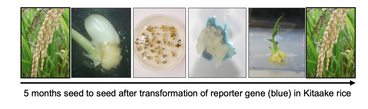These advances allowed individual genes encoding C4 enzymes to be introduced into IR64, with gene activation driven by the appropriate cell-specific promoter – four genes activated in the mesophyll cells and one in the bundle sheath cells. Genetic crosses began to combine the 5 C4 genes into a single line, a process that took 7 years to complete. Fixation of carbon dioxide into C4 acids was detected in the ‘stacked’ lines but with each of the 5 transgenes inserted into a different region of the genome, the lines were inherently complex and difficult to work with (published in 2020 see paper here). In 2014, synthetic modular cloning was therefore adopted across the consortium to facilitate the rapid generation of constructs containing multiple genes that could be inserted into a single region of the genome. Notably this required the redesign of many cloning modules. For example, commonly used fluorescent reporter proteins could not be detected above levels of autofluorescence in rice and thus modules had to be re-designed for use specifically in rice see paper here. To further speed progress, a transformation pipeline was established that exploited the rapid cycling japonica rice variety ‘Kitaake’, allowing seed to seed generation in 5 months and faster evaluation of multigene constructs. This development expanded the capacity for transformation experiments to four of the consortium labs.