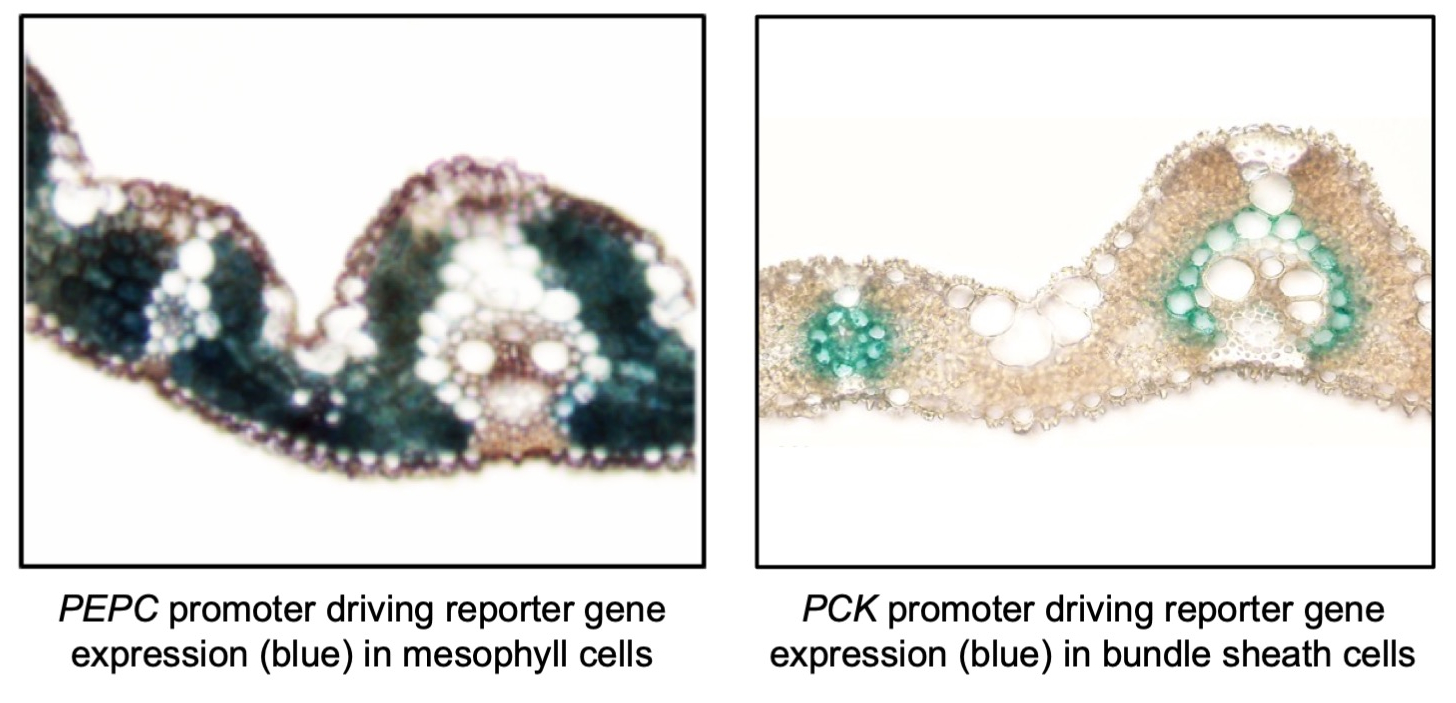 To initiate the work on engineering metabolism, protocols were optimized for the introduction (‘transformation’) of genes into the indica rice variety IR64 and DNA sequences were identified that switched on genes (‘promoters’) in either mesophyll or bundle sheath cells of rice. Notably, most of the promoter sequences that activated cell-preferential gene expression in C4 species, did not replicate that pattern in rice and so the search was long and hard. However, by 2015 a number of promoters that functioned in rice mesophyll cells had been identified and two had been identified that functioned (albeit weakly) in bundle sheath cells.